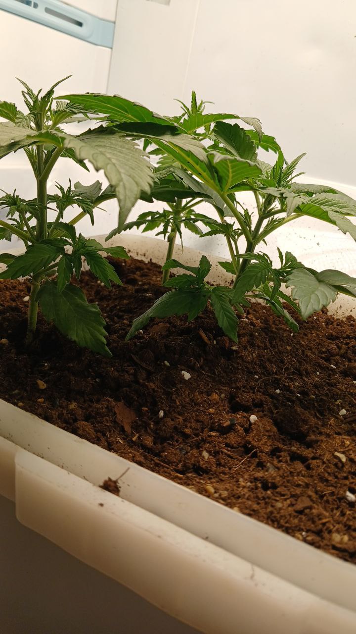 Итак. Купил 5 семян амнезии, 2 загубил по собственной вине (очень спешил хотел под конец лета высадить в ауте) в итоге из 3ех проросло только 1 его посадил в бокс. 2 последних сдохли только показав корешек В итоге та что расла в боксе изначально вытянулась очень сильно вверх и развивалось как моя зарплата - медленно и незначительно. Сменил лампу на 400в и дело вроде бы пошло. Земля питер про для цветов купил на вб. На фото чуть больше 2ух недель, пора наверное кормить хотя земля с перлитом мощная сама по себе, подрезать не хочу но наверное придется если будет сильно тянуться а то бокс маловат
